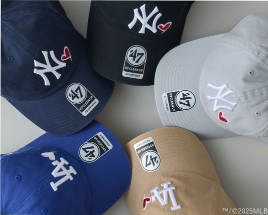 1947年に米国ボストンでスタートしたカジュアルライフスタイルブランドである’47(フォーティーセブン)は、ブランドを代表する定番シルエット「CLEAN UP(クリーンナップ)」の新作として、MLB(メジャーリーグ・ベースボール)のニューヨーク・ヤンキースおよびロサンゼルス・ドジャースの球団ロゴにハートアイコンを組み合わせたデザインのキャップを、公式オンラインストア、'47長野をはじめ全国の’47取扱店舗にて発売いたしました。