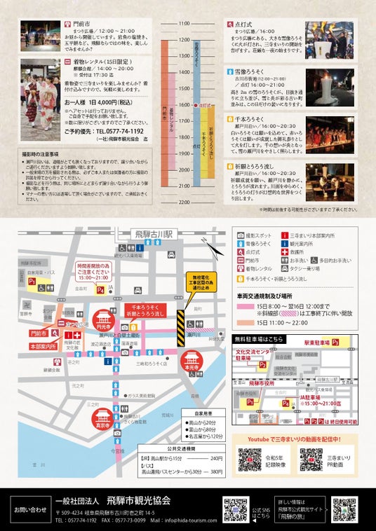※JR飛騨古川駅より徒歩5分。除雪による堆雪もあり駐車スペースには限りがありますので、公共交通機関でのご来場が便利です。