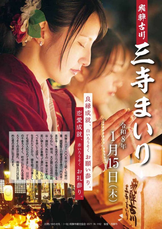三寺まいりは浄土真宗の宗祖・親鸞聖人の御遺徳を偲び、町内にある円光寺・真宗寺・本光寺の三寺を巡拝する、200年以上続く伝統あるならわしです。明治・大正期には、飛騨から野麦峠を越えて信州の岡谷・諏訪へ糸引きの出稼ぎに出た女性たちも、一年の奉公を終えて帰省し、この日に着飾って瀬戸川沿いを歩いて巡拝したことから、男女の出会いが生まれ、やがて縁結びの行事としても知られるようになりました。当日は、正午から「まつり広場」で、飛騨の食を楽しめる「門前市」も開催され、16時からは瀬戸川と白壁土蔵街には千本のろうそくが並び、市街地の通りには高さ約2メートルの雪像ろうそくが立ち並びます。