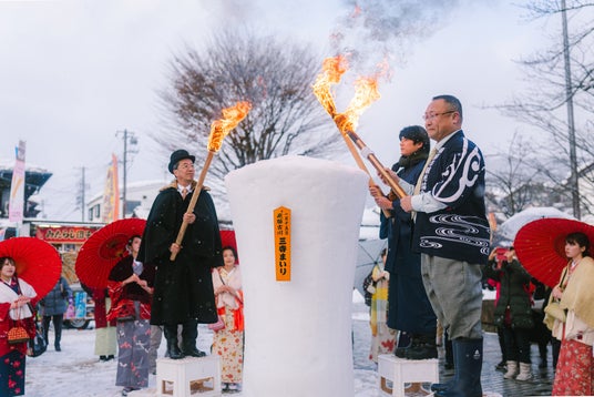 2メートルの雪像ろうそくが町中に立ち並ぶ。飛騨古川で200年以上続く冬の伝統行事が1月15日(木)に開催されます。当日は門前市にて飛騨の食も堪能できます。