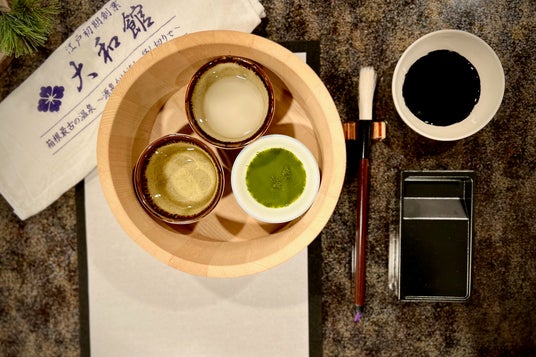 温泉水を使って墨を溶くことで、ただの水とは異なる独特の「にじみ」や「グラデーション」が生まれます。また、異なる温泉の香りを比べるなど、五感を使いながら箱根の泉質の違いを体感できます。