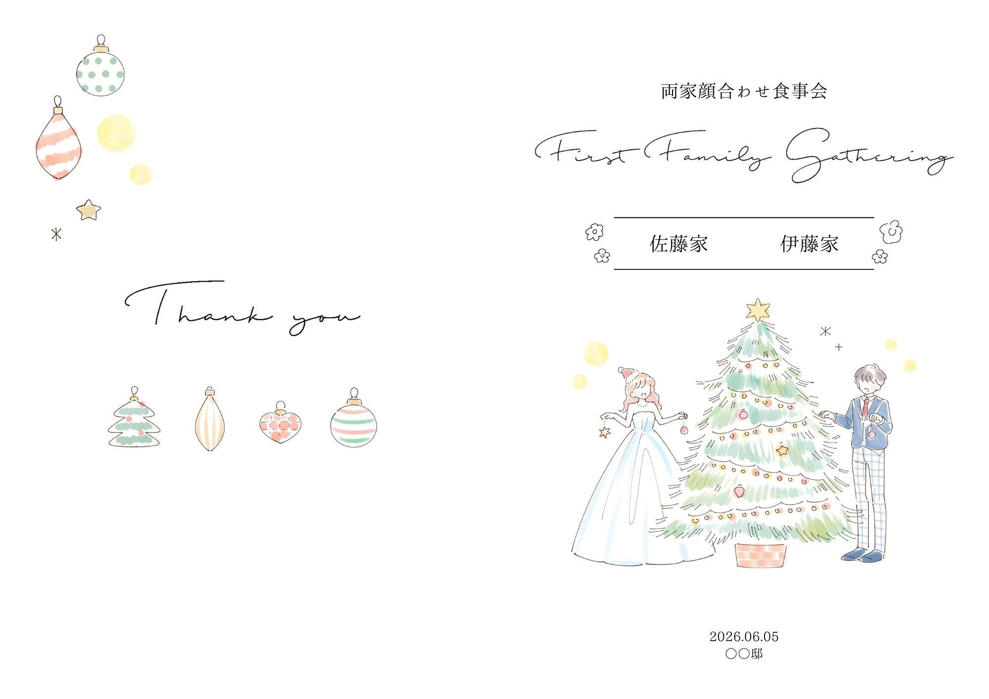 クリスマス気分を盛り上げるデザイン♪仲良くツリーを飾りつける新郎新婦の姿がかわいらしく、さりげなく描かれたオーナメントが大人っぽいおしゃれさを演出します。
