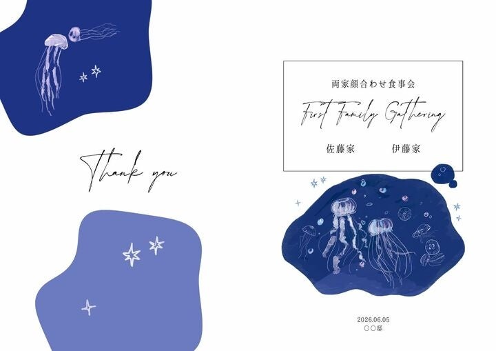 光の粒に照らされながら、クラゲたちが静かに舞う海の情景を描いたデザイン。水面のようにゆらめくデザインは、ふたりの穏やかな日々と寄り添う愛をイメージしています。