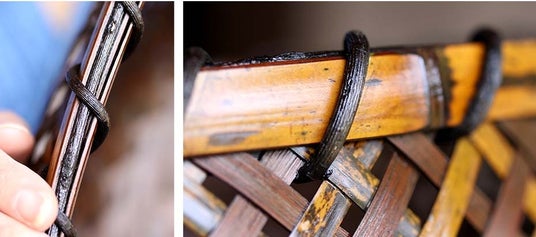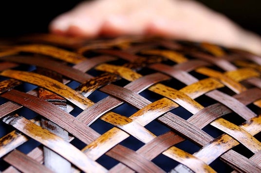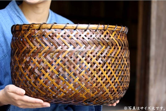 また、縁部分には自然のつる「カズラ」を使用し、素朴で野趣あふれる雰囲気をプラス。内側の底には、虎竹の表皮と身部分を巧みに組み合わせた美しい網代(アジロ)編みが施され、底の補強には「力竹(ちからだけ)」が十文字にしっかりと入れられ、実用性にも優れています。