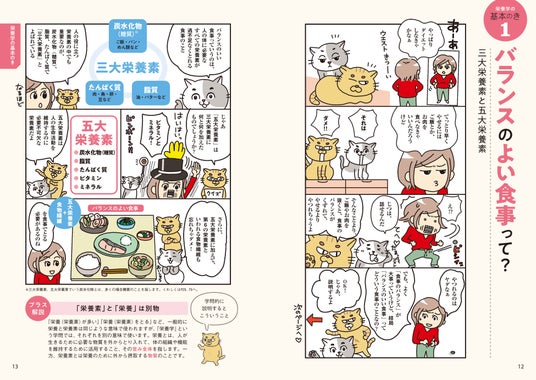 これから栄養と健康について学ぼうとするすべての人へ向け、栄養学の基礎知識から最新トピックまでを網羅し、マンガと図解を多用して解説した本です。案内役は2匹のネコ。第1章と第2章は、主人公と2匹のネコの掛け合いにより、知っているようで意外と知らない食と栄養の知識がぐんぐんと身につく作りです。