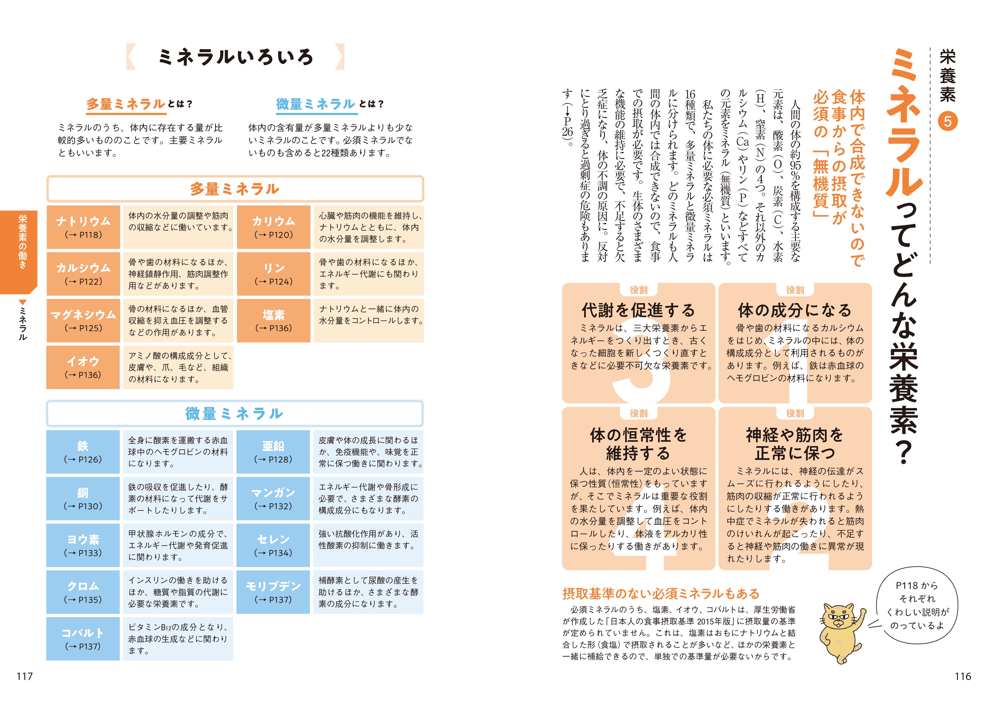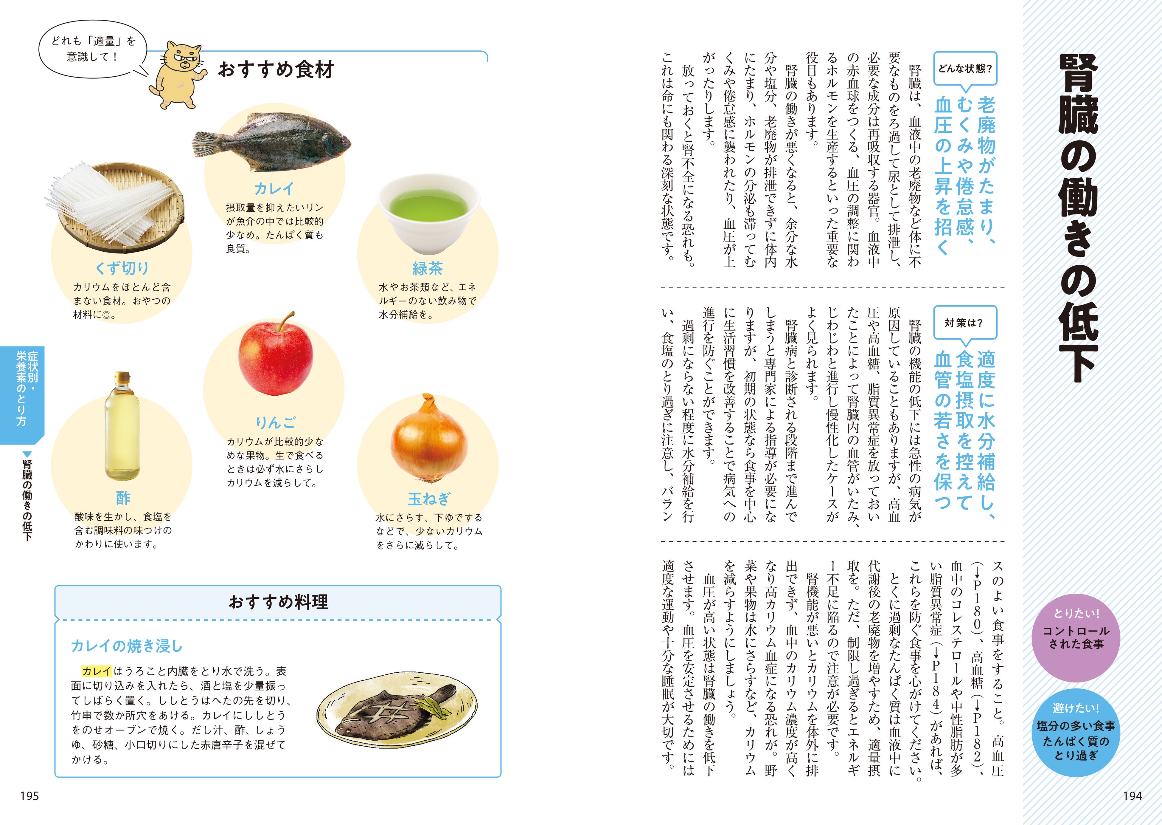続く第3章では各栄養素の効率のよい食べ方、第4章では症状別のおすすめレシピ、第5章では食品ごとの栄養成分や栄養を逃さない調理法と、栄養知識を毎日のごはんに活かすための情報も満載。