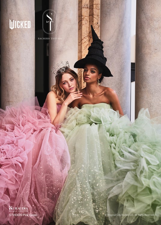 本フォトプランでは、<クラウディア>が手がける『WICKED|KURAUDIA』、そしてドレスブランド<SACHIKO TSUTSUI>による『WICKED|SACHIKO TSUTSUI』の2つのドレスコレクションをご着用いただけます。<クラウディア>コレクションは、映画『ウィキッド』シリーズの代表的な劇中衣裳からイメージし、細部まで作り込まれたディテールと技術力で、忠実に表現しました。一方、<SACHIKO TSUTSUI>コレクションは、作品への想いと、壮大な世界観から得たインスピレーションによって誕生。このブランドならではの大人の女性にふさわしい上質さと、立体的な素材表現を追求し、それぞれの個性が美しく際立つデザインに仕上がっています。