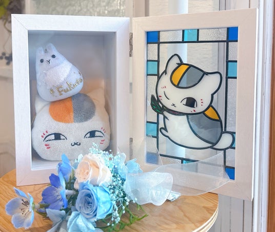 フレームを広げると、右側に「ニャンコ先生のグラスアート」、左側に「お花畑のブーケ」が並び、第11話の情景がパノラマのように広がります。窓辺に置けば、グラスアートが陽の光を取り込み、ブーケと共にキラキラと輝きます。