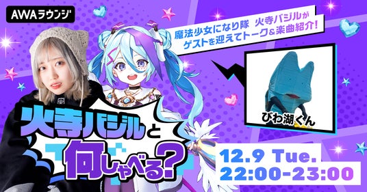 AWA株式会社(本社:東京都港区、代表取締役CEO:冨樫晃己)が運営する、サブスクリプション型(定額制)音楽ストリーミングサービス「AWA(アワ)」は、2025年12月9日22:00~23:00の1時間に渡り、無料で誰でも参加できるオンライン空間「AWAラウンジ」で、ロックバンド「魔法少女になり隊」のボーカルでアパレルブランドのプロデュースやVTuber配信などマルチに活動する火寺バジルがMCを務めるAWAラウンジ公式番組「火寺バジルと何しゃべる?」の第4回を開催いたします。