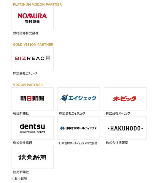 「ビジョンパートナー」朝日新聞社、株式会社エイジェック、株式会社オービック、株式会社電通、日本管財ホールディングス株式会社、株式会社博報堂、読売新聞社 ※五十音順