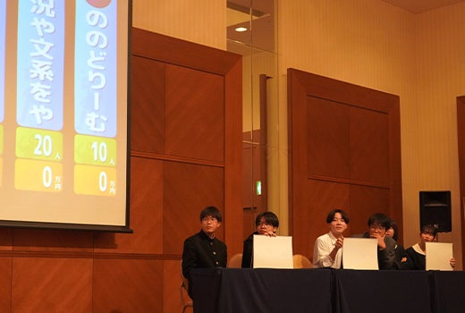 今年は、他校の生徒の皆さんと直接交流することで視野を広げてほしいという思いから、3年ぶりに対面形式による大会を開催いたしました。県内の高校に通う20名の皆さんがそれぞれ2名1チームでエントリーし、税や保険などの金融経済に関する筆記クイズ、早押しクイズなどに挑戦し、上位6チームが決勝ラウンドに進みました。決勝ラウンドはアイドルビジネスをテーマに、各チームがアイドルユニットとして、ファンの数を増やしながら最終的に売上高の大きさを競うゲームを行いました。ボードクイズの形式で行われ、クイズに正解すると、売り上げをとるか、ファンを増やすか、どちらを選択するかを戦略的に考えてもらう内容となっており、各チームはそれぞれ独自の戦略を取りながら熱戦が繰り広げられ、大分県立別府翔青高校のカボスパラダイスチームが見事優勝を勝ち取りました。カボスパラダイスチームチームのお二人は、2026年2月21日(土)~22日(日)に東京で開催されるエコノミクス甲子園全国大会において、大分県代表として、各地方大会の優勝チームと戦います。