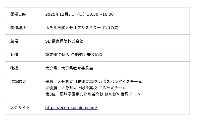 SBI損害保険株式会社(本社:東京都港区、代表取締役社長:小野尚、以下「SBI損保」)は、2025年12月7日(日)にホテル日航大分オアシスタワーにて、「第20回全国高校生金融経済クイズ選手権『エコノミクス甲子園』大分大会(以下、「本大会」)」を開催いたしました。事前に配布された教材で税や保険について学んだ県内の高校生の皆さんが、熱戦を繰り広げ、全国大会出場校が決定いたしました。