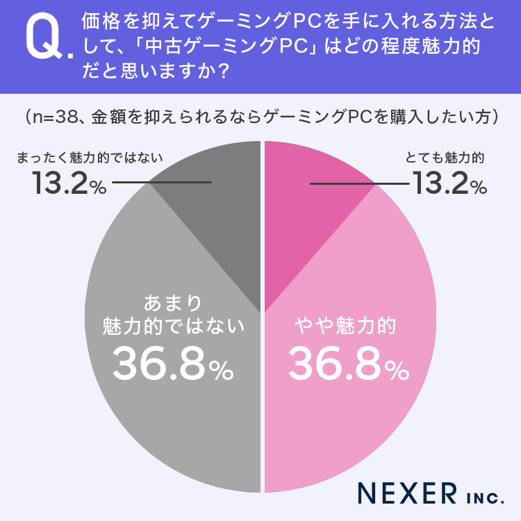 13.2%が「とても魅力的」、36.8%が「やや魅力的」と回答し、2人に1人の方が中古ゲーミングPCを魅力的と感じていることが分かりました。