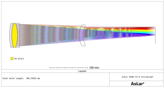- Askar 60F鏡筒は、口径60mm焦点距離408mm口径比F6.8のED屈折望遠鏡です。