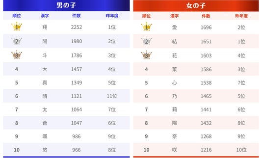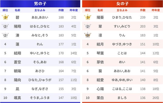 一方、女の子の名前ランキングTOP3は、1位「陽葵(主なよみ:ひまり)」、2位「翠(主なよみ:すい)」、3位「凛(主なよみ:りん)」という結果に。「陽葵」と「凛」は安定した人気を維持しており、近年注目度が高まっている「翠」は2位へと順位を伸ばしました。