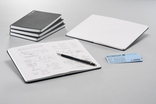 ULTRAFLAT(R) 13” は、新開発のウルトラフラット製本により、全ページが一枚の紙のように展く、見開き13インチ・200ページのハードカバーノートです。一枚の紙のように広がるキャンバスが、従来の端から順に書く規則的な筆記スタイルを、全体を俯瞰する自由な筆記スタイルへと変革します。
