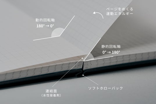 一枚の紙のように展く、ウルトラフラットな見開き性中央の段差を意識せず、見開き全体が一枚の紙のように広がります。また、ページのバウンドを抑え、安定した筆記を可能にし、思考の全体像を俯瞰しやすくします。