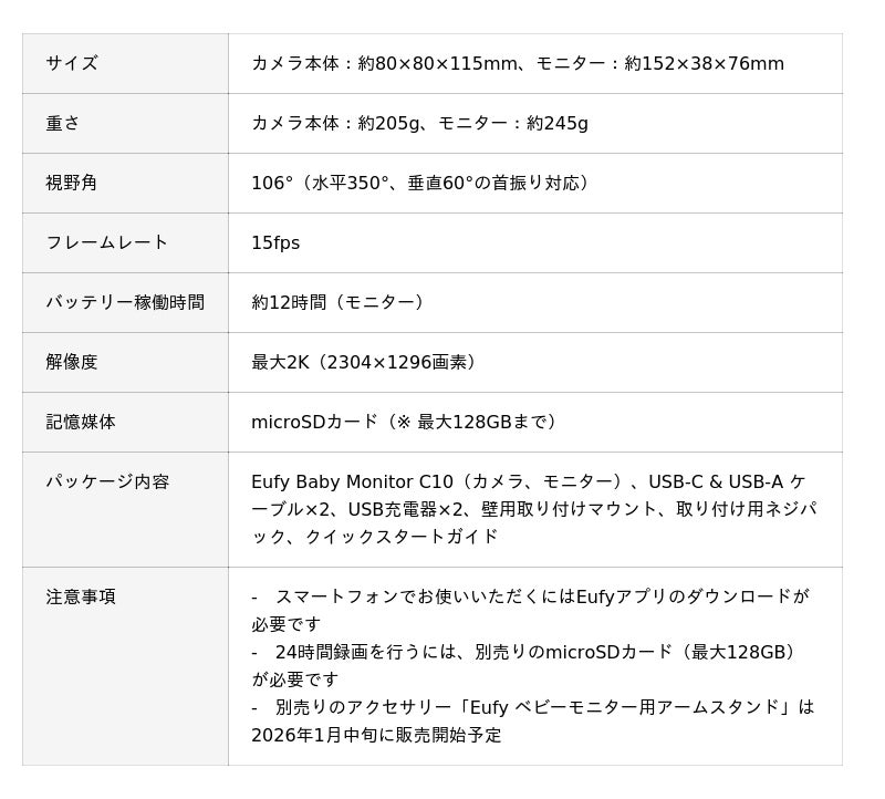 ※3 別売りのアクセサリー「Eufy ベビーモニター用アームスタンド」は2026年1月中旬に販売開始予定