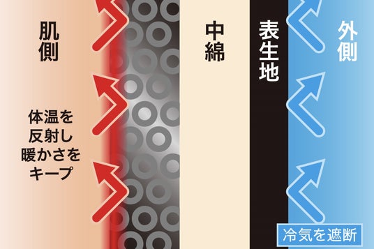 ・アルミプリントが体温を反射し温かさをキープ、防風性に優れた生地と中綿で冷気を遮断