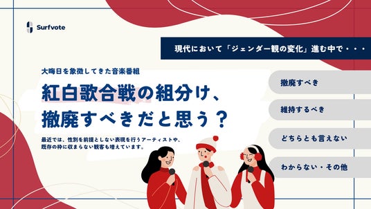 Surfvoteでは現在、「紅白歌合戦の組分け、撤廃すべきだと思う?」というテーマで意見を募集しています。