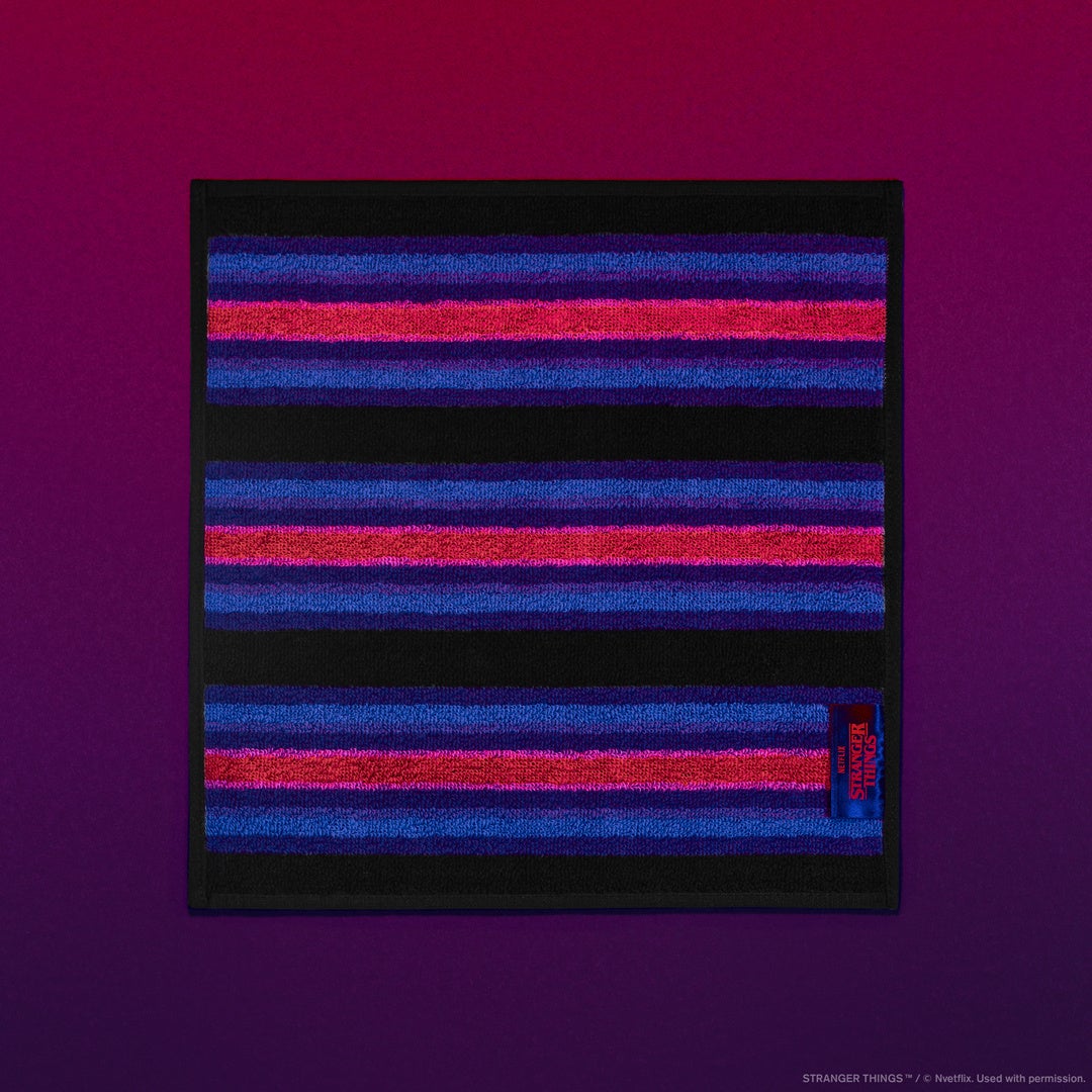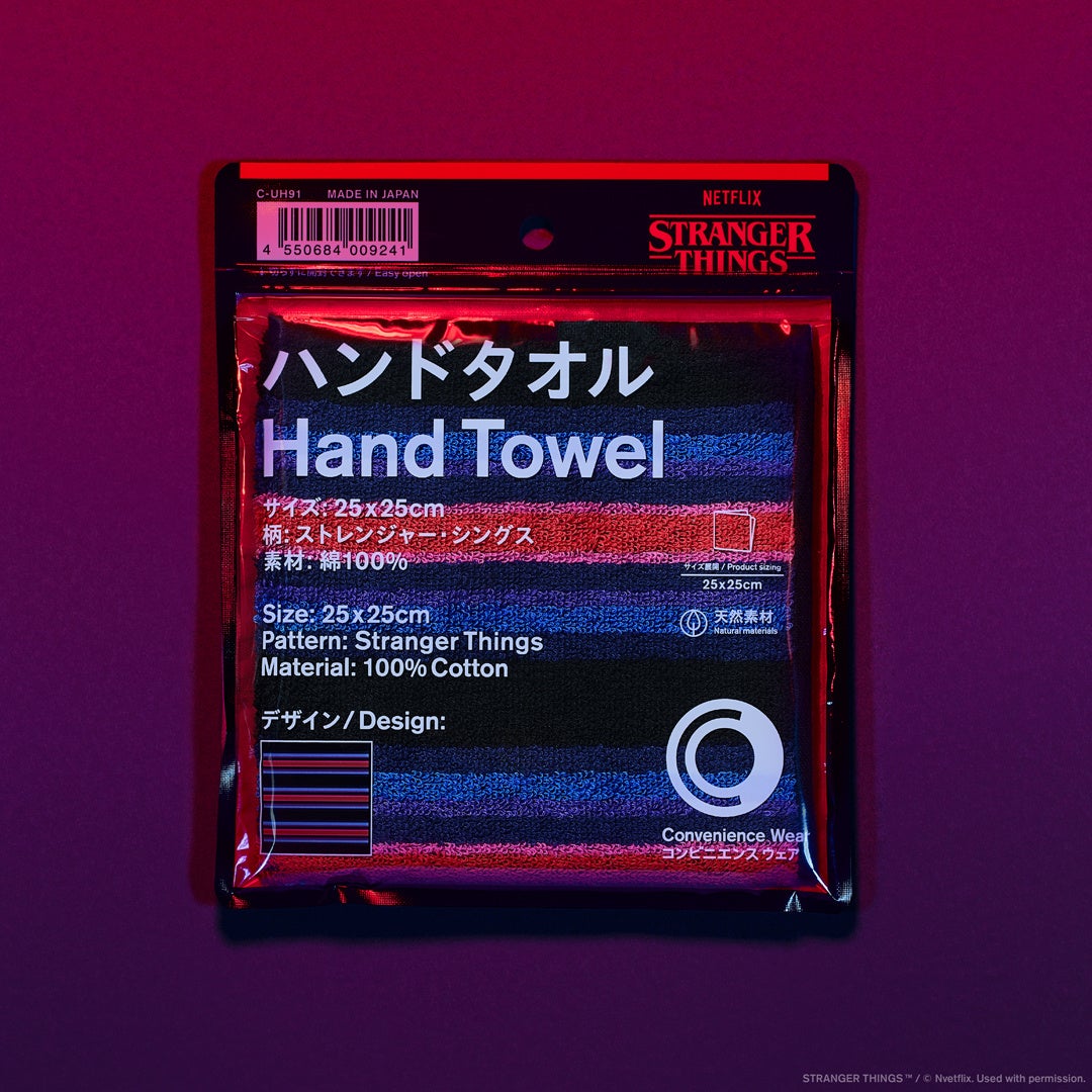【内容】「ストレンジャー・シングス 未知の世界」をモチーフに配色した今治製のハンドタオルで、高吸水仕様です。ストレンジャー・シングスのオリジナルタグを付けました。