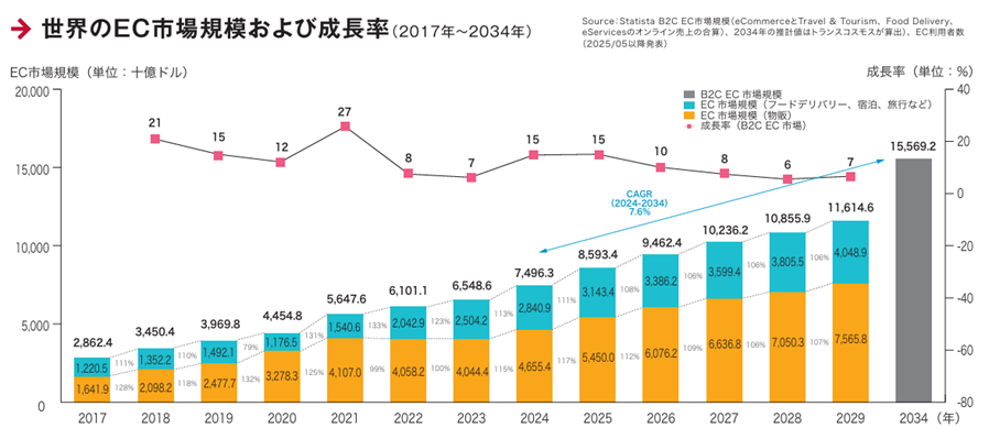 2024年の世界のB2C EC市場規模は、前年比114.5%の7兆4,963億ドル(約1,087兆円)となりました。世界全体の市場としては引き続き拡大傾向にあるものの、パンデミック直後の急成長が落ち着き、特に成熟市場では成長率の鈍化が見られました。今後は、年平均7.6%の成長率で拡大し、2034年には15兆5,692億ドル(約2,258兆円)に達する見込みです。
