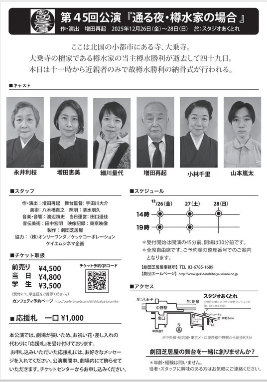 劇団芝居屋第45回公演『通る夜・樽水家の場合』が2025年12月26日 (金) ~ 2025年12月28日 (日)に中野スタジオあくとれ(東京都 中野区 中野 2丁目11-2 サン中野マンションB1)にて上演されます。