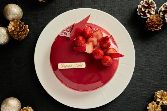 フランス語で“クリスマスの赤”という意味のノエル・ルージュ。キリスト教で愛と寛大さを表す赤色は、クリスマスを象徴するカラーのひとつです。いちごのデコレーションはまるで宝石のよう。ピスタチオのダックワースにフランボワーズとチョコレートのムースを重ねた、大人な味わいのクリスマスケーキです。