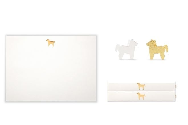 きなりの和紙に馬の箔押しを施した箸入れとランチョンマット、小さな馬の立体的な置き飾りが、晴れの日の食卓を上品に演出します。