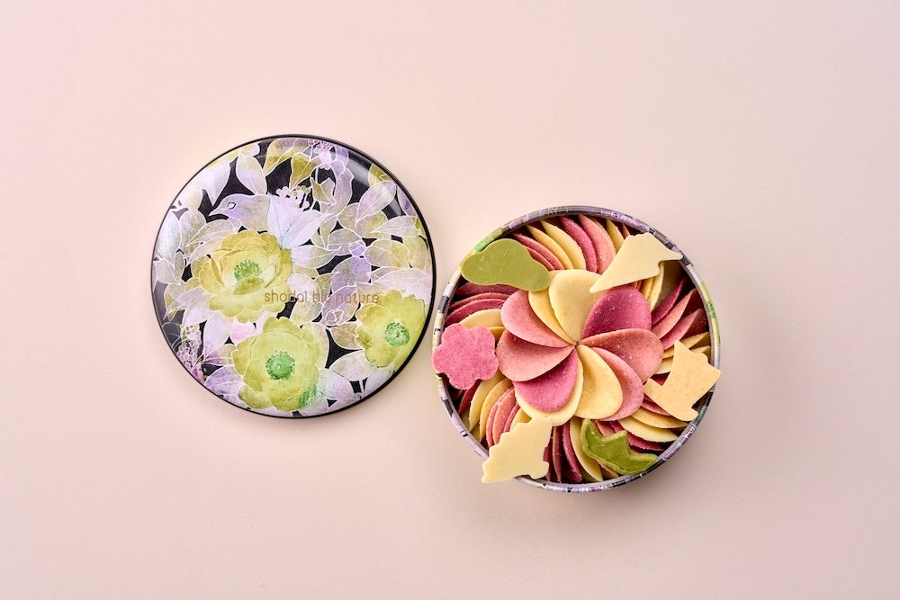 2026年の始まりに彩りを添える、季節限定のペタルチョコレート。黒地に椿と鶯を描いた蒔絵風のデザイン缶には、新春の華やぎを思わせる彩りが咲き誇ります。木苺や苺の甘酸っぱさに、レモンの爽やかな香りを重ねた、優しくみずみずしい味わい。大切な方への新年の贈り物にも最適です。