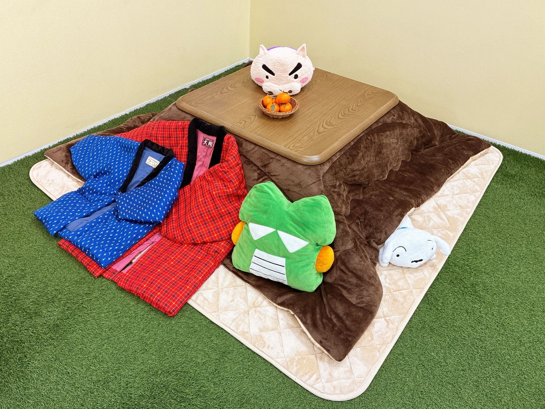 期間中は、あそび場の芝生にこたつを設置し、アニメの作中に登場するお菓子がモチーフの「すごろくチョコビ」のすごろくや、かるたやトランプなどのテーブルゲームを楽しむことができます。冬の風物詩である「こたつ」を囲い、野原一家の気分をお楽しみください。