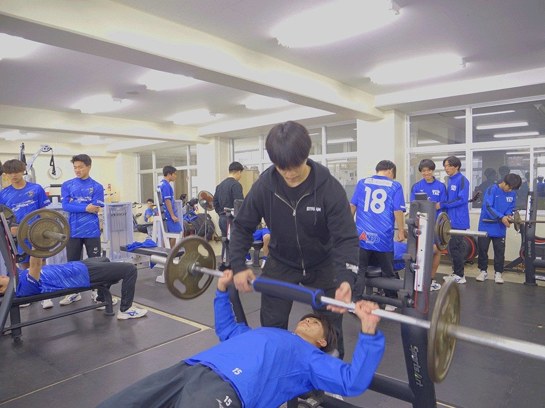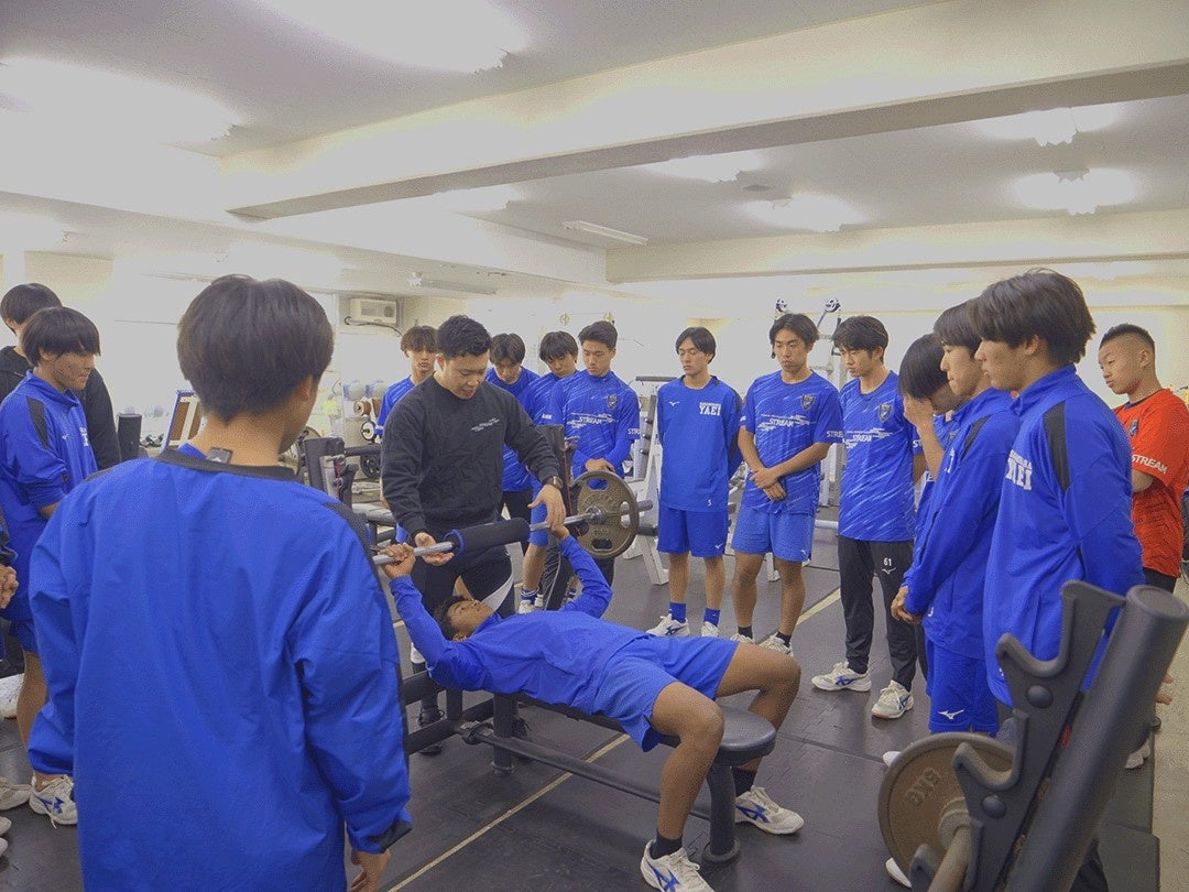 当社は本年9月、同校サッカー部に対しユニフォーム寄贈などの物品支援を行いました。 その支援を通じて現場との交流が深まる中で、監督から「選手たちのフィジカル(身体の強さ)に課題を感じているが、専門的な指導ができていない。スポンサー支援以外に、筋力トレーニングの指導をお願いできないか」という打診をいただきました。「設備はあるのに、使いこなせていない」。 教育現場が抱えるこの課題に対し、自身も同校サッカー部出身である代表の吉川は、「プロのアドバイスで、メンバー個々でも効率よくトレーニングができる正しい知識を身に着けてもらい、高め合う強いチームづくりに貢献できれば」と快諾。STREAMの実力派トレーナー2名とともに現地へ赴き、実技指導を行う運びとなりました。