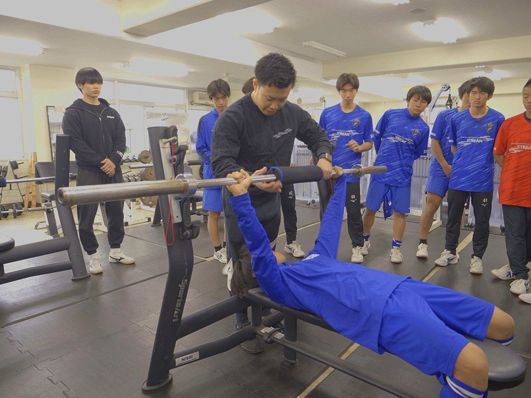 当日は、「当たり負けしない身体づくり」をテーマに指導を行いました。サッカーにおける「当たり負け」とは、相手選手と身体がぶつかった際に力負けし、ボールを奪われたり転倒したりしてしまうことです。「技術はあるのに、フィジカル(身体の強さ)で押し負けて実力が発揮できない」という高校生特有の課題を解決するため、今回はウエイトトレーニングの基本にして奥義である「ビッグ3(ベンチプレス、スクワット、デッドリフト)」を徹底指導しました。