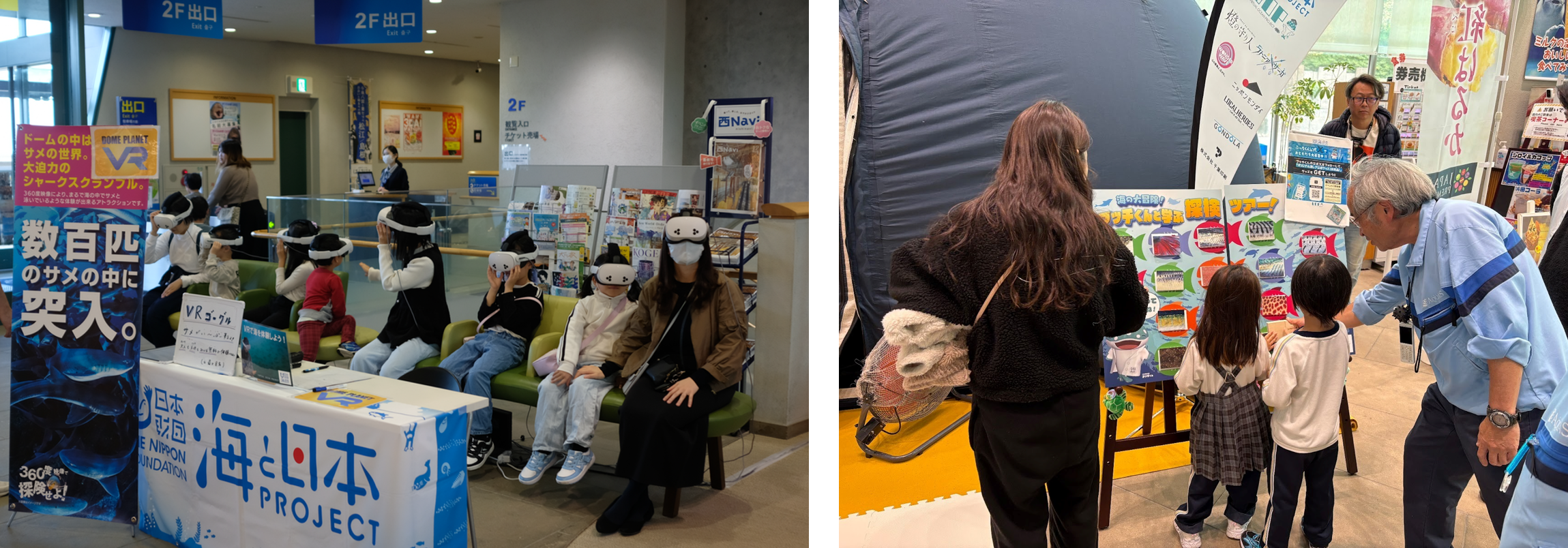 ・開催概要:島根県立しまね海洋館アクアスにて、Virtual Ocean Project企画「海の大冒険!ブッチくんと学ぶ探検ツアー!」として、360度映像のエアドーム型体験プログラムを開催しました。参加者に、海中映像とナビゲーターのジンベエザメのブッチくんとのリアルタイム対話を通じて、海の魅力や海洋問題について学ぶ機会を提供しました。また、VRゴーグルによる海中遊泳体験、魚の鱗の凹凸を再現した「さかなかるた」パネルを設置し、五感を刺激するプログラムで多角的に海への関心を深めました。
