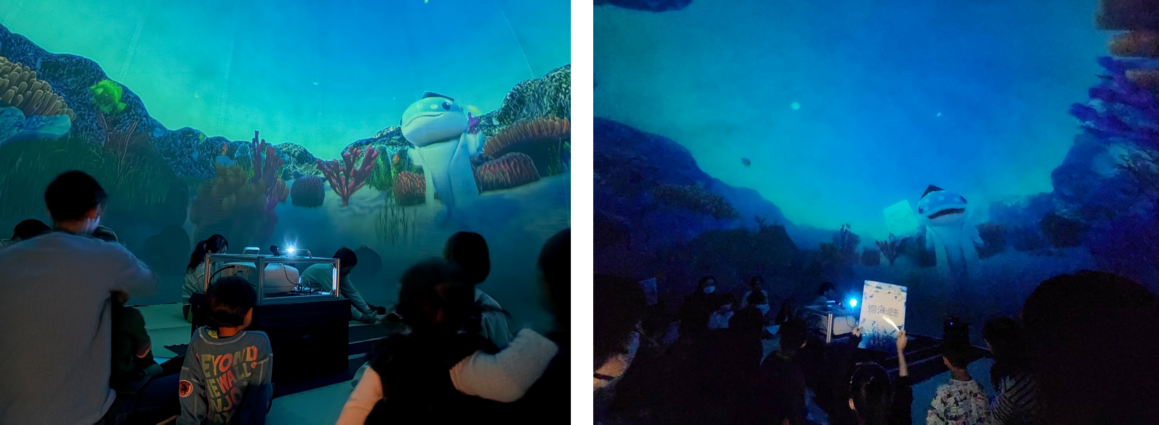しまね海洋館アクアスの2階にあるシロイルカパフォーマンスプールの出口の目の前に設置したエアドームは、水族館の最後の探検として来場者を出迎えました。このドーム内に一歩足を踏み入れると、そこには360度全方位に広がる海の世界が参加者を包み込みます。「海の大冒険!ブッチくんと学ぶ探検ツアー!」では、探検ツアーのナビゲーターとして、おしゃべりなジンベエザメのキャラクター「ブッチくん」が登場し、まるで本当に海に潜っているかのような臨場感あふれる映像の中、参加者を海の大冒険へと誘いました。ブッチくんの声は、吉本興業所属の俳優・グッド良平。さんと太田プロダクション所属の芸人・こいでまほさんが担当しました。ユーモアあふれるトークで参加者の子どもたちとリアルタイムな掛け合いを繰り広げ、会場を沸かせました。