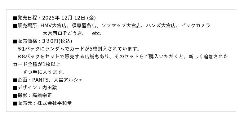 今回の拡張パックには、浦和が生んだロックレジェンド「タケカワユキヒデ」さん、浦和を代表する銘菓「彩果の宝石」、サッカーの聖地「埼玉スタジアム2〇〇2」、地元を代表する老舗書店「須原屋」、など浦和カード10種、大宮発祥の大人気チェーン「日高屋」、全国鉄道マニアの聖地「鉄道博物館」、ビックカメラで大人気の店舗擬人化キャラクター「ビッカメ娘」より「大宮たん」、チャリティ歌謡祭でもカルトな人気を誇る「ガスワンの川本会長」、など大宮カード10種、合計20種の新規カードが収録されています。