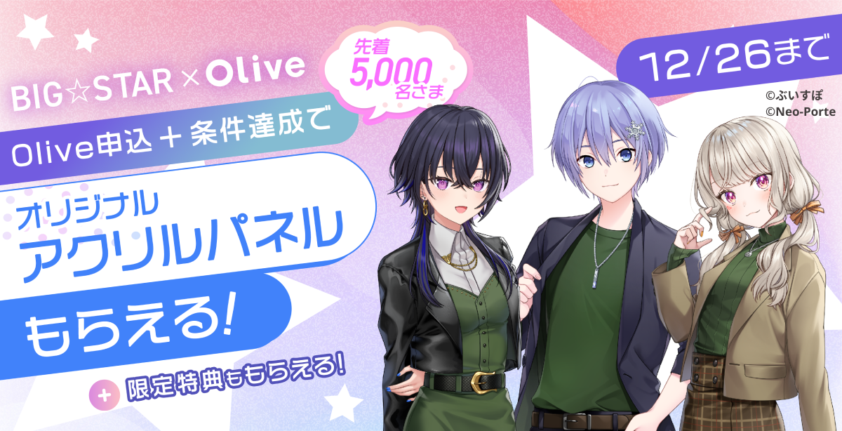 株式会社バーチャルエンターテイメント(本社:東京都港区、代表取締役:星 崇祥、株式会社Brave group100%子会社)および株式会社Neo-Porte(本社:東京都港区、読み:ネオポルテ)は、所属タレントの「一ノ瀬 うるは(ぶいすぽっ!)」「小森 めと(ぶいすぽっ!)」「白雪 レイド(Neo-Porte)」による『BIG☆STAR』と、株式会社三井住友銀行(頭取 CEO:福留 朗裕、以下「三井住友銀行」)が提供する個人向け総合金融サービス「Olive」とのコラボキャンペーンを開始したことをお知らせいたします。