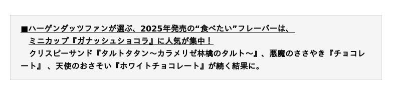全国10代~60代の月1回以上ハーゲンダッツを食べる“ハーゲンダッツファン”の男女300名を対象に、「2025年に発売されたハーゲンダッツ新商品のうち、“食べたい”と思うフレーバー」について聞いたところ、ミニカップ『ガナッシュショコラ』が24.0%を獲得し、人気を集めました。次いで、第2位にはクリスピーサンド『タルトタタン~カラメリゼ林檎のタルト~』(9.7%)、第3位にはミニカップ 悪魔のささやき『チョコレート』(9.3%)、天使のおさそい『ホワイトチョコレート』(9.3%)、第5位にはバー『ザッハトルテ』(7.7%)がランクインしており、チョコレートフレーバーを中心に人気を集める結果となりました。