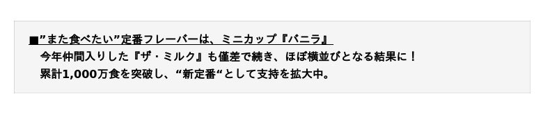 ※ミニカップ定番商品:通年で販売しているミニカップ『バニラ』・『ストロベリー』・『グリーンティー』・『クッキー&クリーム』・『マカデミアナッツ』・『ラムレーズン』・『ザ・ミルク』・ 『ガナッシュショコラ』の8商品。