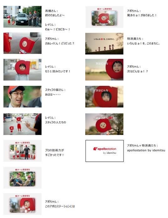 デジタルムービーでは、apollostationの秘密を探るべく結成された「特派員a!チーム」のメンバーとして、原さんが声優を務めるパペットの「アポちゃん」と、TVCMと同じく「a」の赤いかぶり物を身につけた子ども特派員が登場し、apollostationスタッフにプロの洗車・コーティング技術についての取材を行います。apollostationが誇る専門性の高いサービスやスタッフの技術力を発見するストーリーを通じて、お客さまに驚きの“a!(あ!)”や、安心感の“a!(あ!)”を提供するapollostationのメッセージを訴求しています。子ども特派員たちの無邪気な取材ぶりと、的確なツッコミとフォローで現場をまとめるしっかり者のアポちゃんのキャラクター、apollostationスタッフとのほほ笑ましいやり取りにご注目ください。