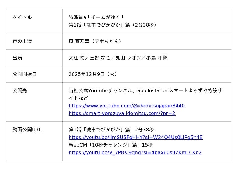 出光興産株式会社(本社:東京都千代田区、代表取締役社長:酒井則明、以下「当社」)は、地域のニーズに合わせて進化するサービスステーション「apollostation(アポロステーション)」のデジタルムービー「特派員a!チームがゆく!」の第1話「洗車でぴかぴか」篇を制作しました。公式YouTubeチャンネルなどでの公開およびWebCMの配信を、本日2025年12月9日(火)から開始します。