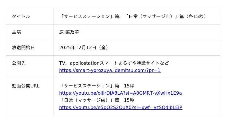 出光興産株式会社(本社:東京都千代田区、代表取締役社長:酒井則明、以下「当社」)は、地域のニーズに合わせて進化するサービスステーション「apollostation(アポロステーション)」のイメージキャラクターに、前年に引き続き俳優の原菜乃華さんを起用し、新TVCM「サービスステーション」篇、「日常(マッサージ店)」篇を2025年12月12日(金)から全国で放映します。
