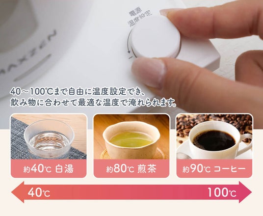 カップ1杯(140ml)の水なら約90秒で沸騰でき(※)、温かい飲み物やインスタント食品を手早く用意したい、これからの冬の季節に重宝します。また、お湯は、40~100℃の間で、1℃単位で温度設定ができるため、コーヒーやお茶、白湯などそれぞれの飲み物をおいしく召し上がれる温度でお楽しみいただけます。※満水時では約7分00秒ほど、沸騰までの時間を要します。
