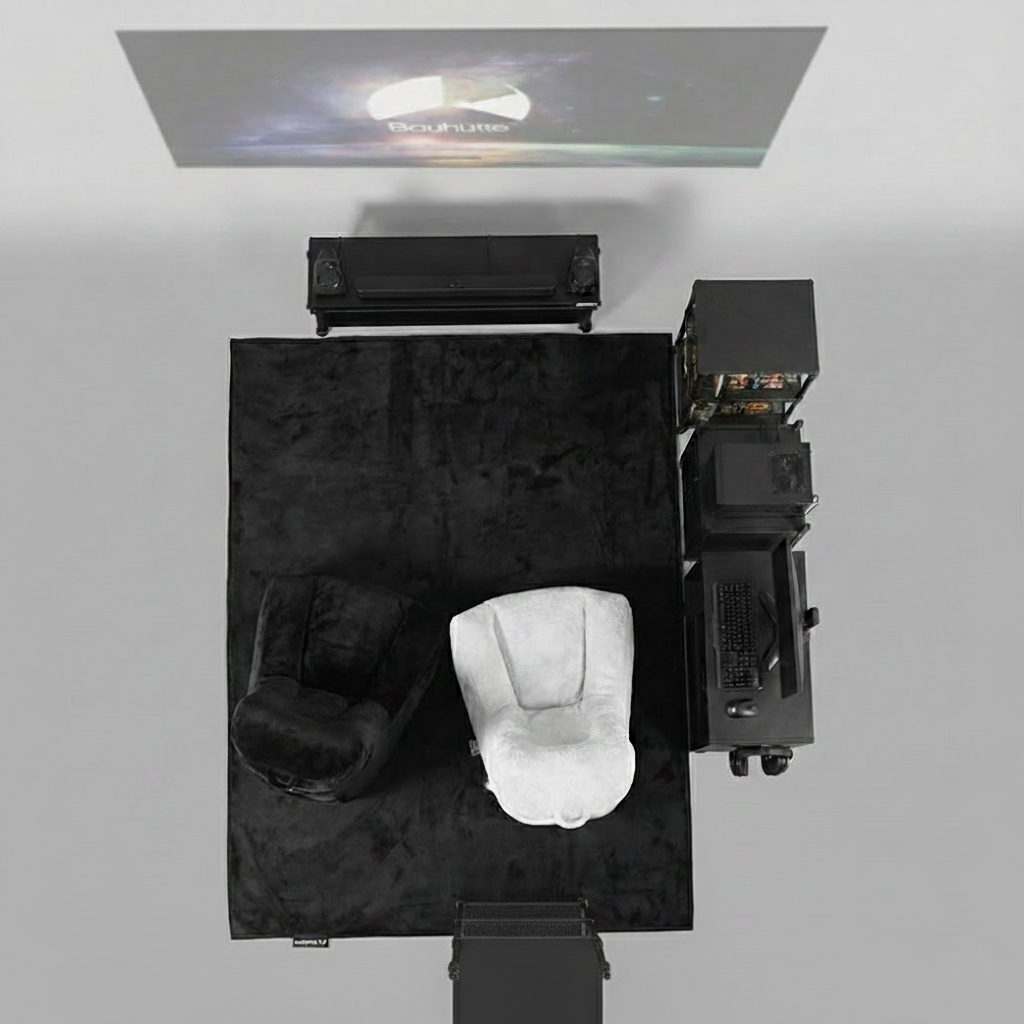 部屋を100インチ超えの大画面シアターに魔改造するレイアウトを新たに考案。プロジェクターを天吊りラックで空間を邪魔せずスマートに設置し、テレビ台やスピーカースタンドの高さも自由に調節することで、大迫力の映像とサウンドを最適なポジションで楽しめるのが特長です。ソファや着る毛布にくるまりながら、ふかふかのラグの上でぬくぬくとゲームに没頭可能。ゲーム機やデバイスの収納にも配慮し、ごちゃつきがちな配線や機材を隠しつつ、必要な時にすぐにアクセスできる機能性を両立させた、究極の「おこもりシアター」環境です。