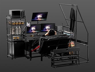 「自堕落ゲーマーを“衣食遊眠”の極致へ誘う」究極の冬ごもりレイアウト。その最大の魅力は、暖房なしで全身をぬくぬく温められる点です。ベッド用デスクや昇降式の背もたれを組み合わせることで、布団から一歩も出ずにPC作業、食事、そしてゲームまで全て完結します。大画面モニターやタブレットをアームで最適な位置に調整し、ヘッドセットや飲み物も手の届く場所に配備。寒い冬の朝、「布団から出たくない」という切実な願望を、そのまま最高のゲーム環境へと昇華させます。