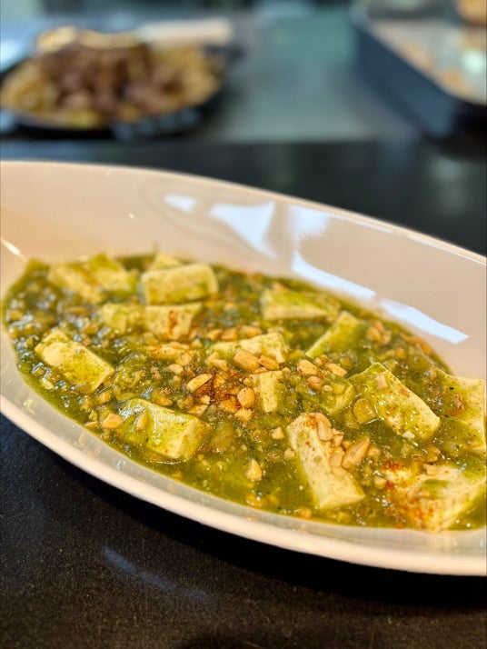 「緑の麻婆豆腐」は、十勝産大豆の豆腐をたっぷりと使い、緑色の野菜、大豆ミート、生姜、にんにくなどを使用し、完全植物性ながらも花山椒と唐辛子の辛みが効いた本格的な味わいに仕上げました。動物性食材を使わずとも、安心してタンパク質が摂れるメニューとして、動物性食品を控えるお客様のみならず、一般のお客様からも「おいしくてヘルシー」と好評をいただいています。