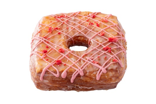 サクサクのクロワッサン生地をドーナツ状に成形し、いちごのチョコレートとフリーズドライいちごをトッピングしたかわいいドーナツです。