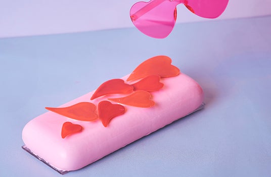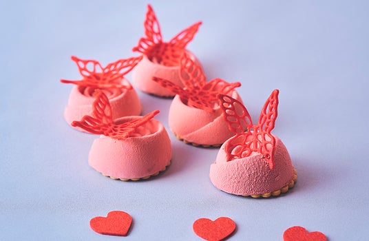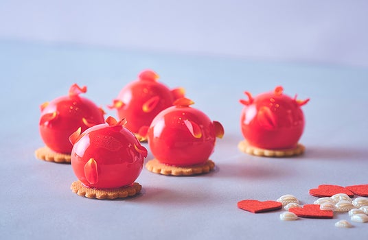 マドレーヌビスキュイにフォレストベリーゼリーと抹茶ババロアをあわせました。ハートをあしらったかわいらしいビジュアルとともにお楽しみください。