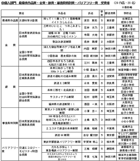 個人部門の最優秀作品賞(文部科学大臣賞)は、東京都 台東区立根岸小学校5年生の浅羽茉莉(あさば まつり)さんの作品「知って!!乗って!!岳南電車イイトコしんぶん」に、学校部門の最優秀学校賞(国土交通大臣賞)は、奈良県 奈良市立六条小学校にそれぞれ決定しました。