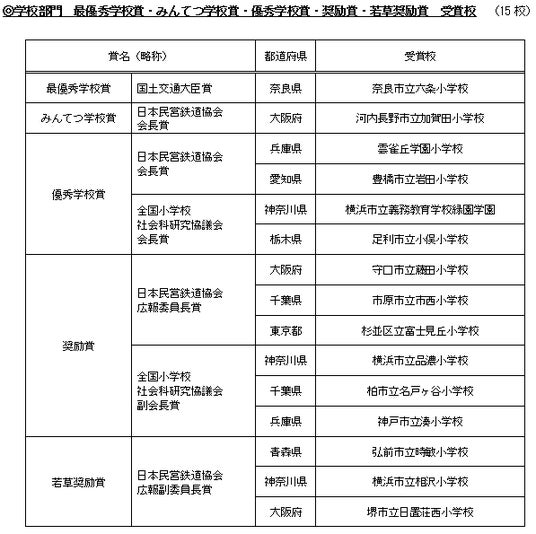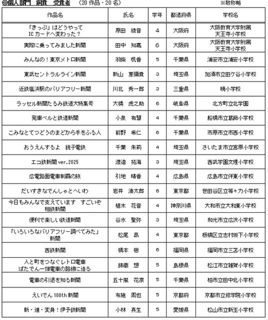 一般社団法人日本民営鉄道協会(事務局:東京都千代田区、会長:杉山健博)は、新聞作りを通じて子どもたちに鉄道に対する関心と理解を深めてもらうことを目的に、第19回「私とみんてつ」小学生新聞コンクールを開催し、このたび、3,099点の応募作品の中から厳正な審査を経て計100作品の受賞者と計41校の受賞校が決定しました。